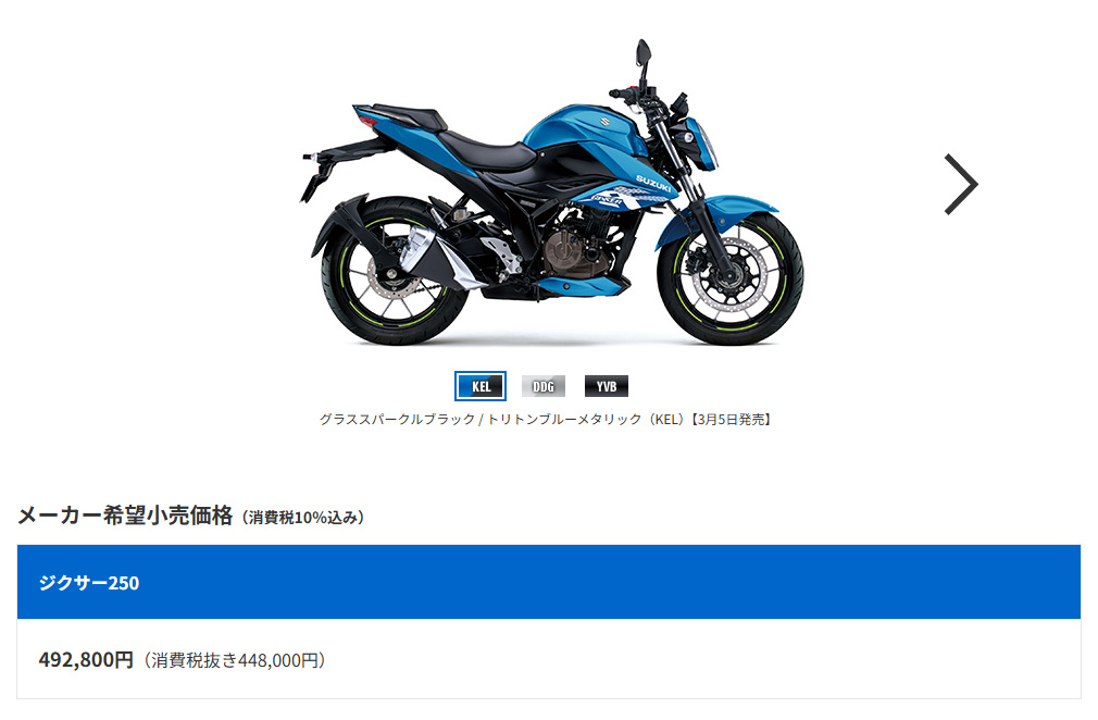 各社250ccクラスは60万円台ですので、ジクサー250系はありがたい存在ですね。